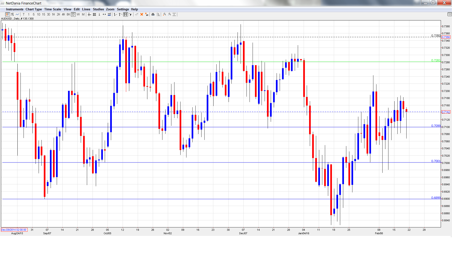 AUD/USD had an uneventful week and posted slight gains. The pair closed at 0.7150. The upcoming week has five events on the schedule. Here is an outlook on the major market-movers and an updated technical analysis for AUD/USD.