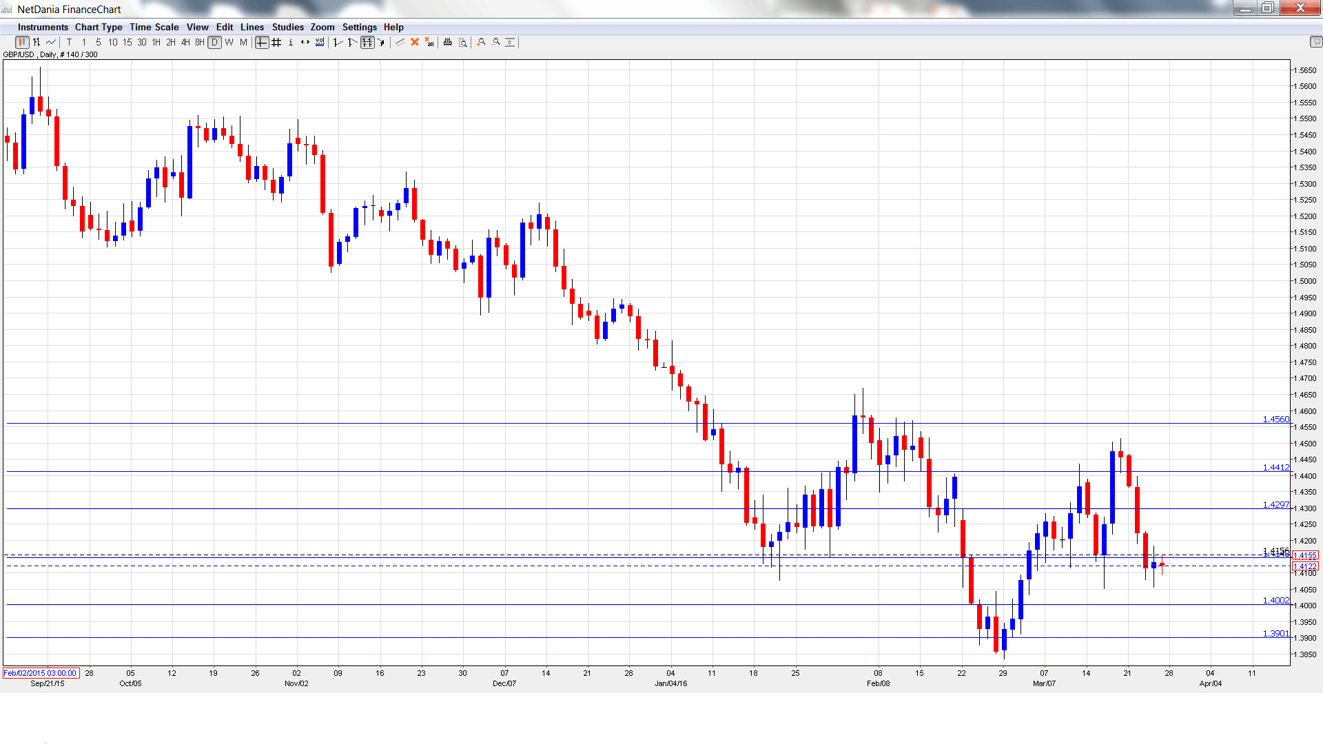 GBP/USD posted sharp losses last week, dropping some 340 points. The pair closed the week at 1.4122. This week’s highlights are Current Account and Manufacturing PMI. Here is an outlook on the major events moving the pound and an updated technical analysis for GBP/USD.