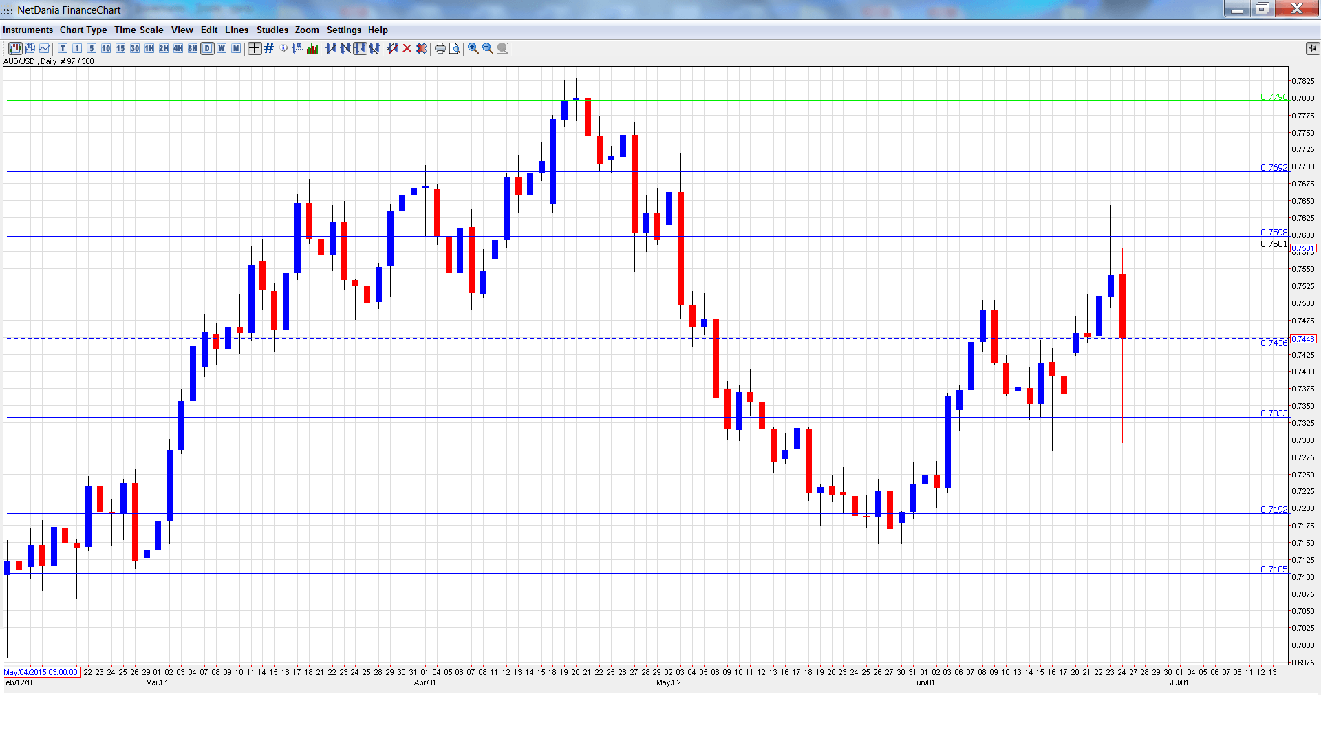 [do action=”autoupdate” tag=”AUDUSDUpdate”/]AUD/USD graph with support and resistance lines on it. Click to enlarge: