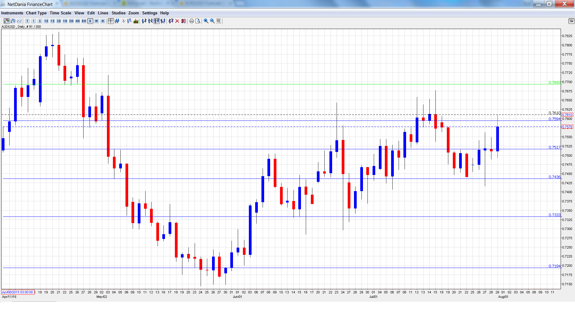 [do action=”autoupdate” tag=”AUDUSDUpdate”/]AUD/USD graph with support and resistance lines on it. Click to enlarge: