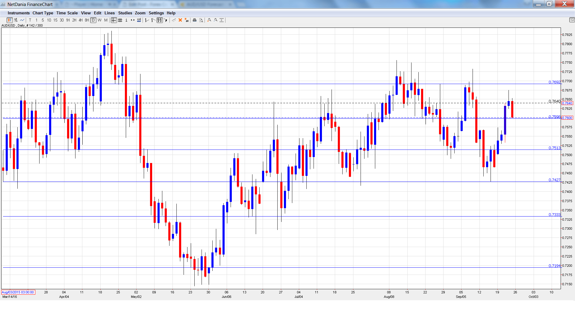 AUD/USD climbed 100 points last week, its strongest weekly gain since late July. The pair closed just above the 0.76 line. There are five events this week. Here is an outlook on the major market-movers and an updated technical analysis for AUD/USD.