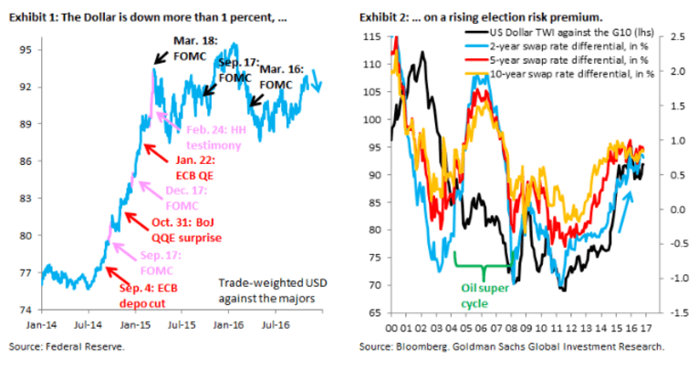 We show that recent Dollar weakness is associated with a meaningful pullback in market pricing for the Fed, with cumulative hikes through end-2017 falling to 32 bps as of Friday, down from 41 bps a week earlier. That said, the drop in the Dollar has gone beyond what rate differentials indicate, suggesting that a risk premium has formed even beyond expectations for Fed hikes.