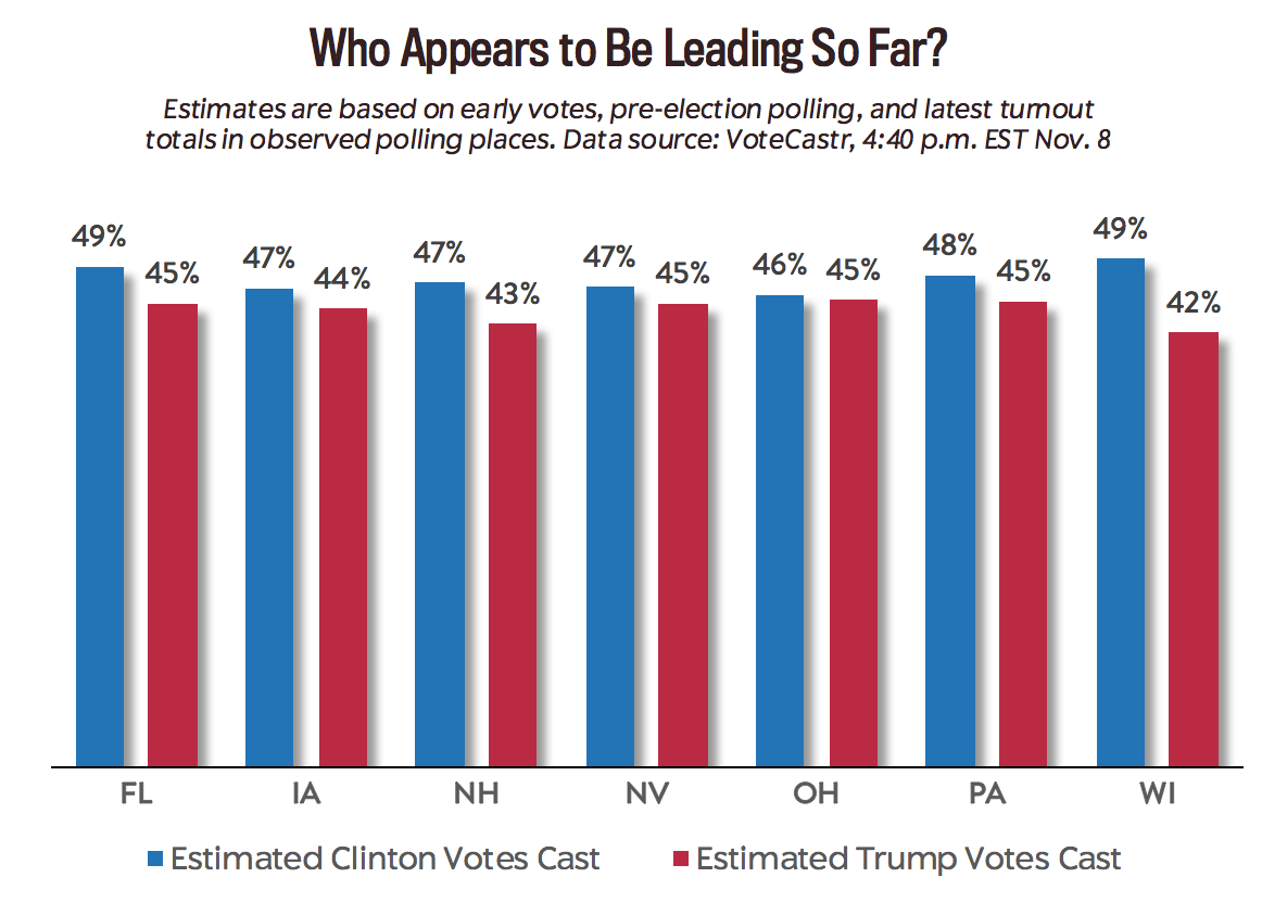 The people behind VoteCastr continue casting their projections, based on turnout. This is an unprecedented experiment that could prove wrong of course, but the methodology makes sense. According to the data they publish, Hillary Clinton is on track to win almost all swing states: Florida (thanks to a massive Hispanic vote),  Colorado, Wisconsin, Pennsylvania, Nevada and even Ohio, leaving Trump with only Iowa. If the  turnout data that VoteCastr projects  continues this way, she is on track to a landslide victory in the electoral college.