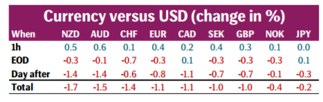 2. Continued to weaken versus all G10 currencies the first hour after the hike was announced