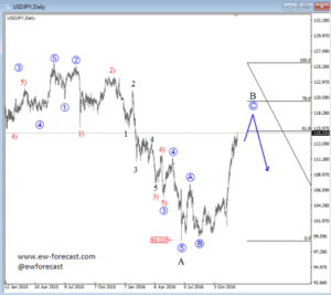 On the daily chart of USDJPY we are observing a nice impulsive higher degree reversal taking place labeled as a three wave A-B-C rise within black corrective wave B. If that is the case, the recent sharp upward reaction is the final push within the final blue wave C which may find an ideal resistance and reversal zone near the 61.8 or even 78.6 Fibonacci ratio, from where bears may again take over.