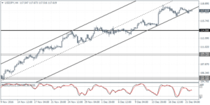 USDJPY (117.61): USDJPY continues to post a consolidation near 118.00 handle with the Stochastics on the daily chart staying firmly above the overbought level of 80. This increases the risk of a whipsaw in the near term as USDJPY could push higher to squeeze out any potential short positions while also trapping any weak long positions near the 118.00 – 118.50 region. The support at 114.00 looks increasingly likely as a price level that USDJPY could retest. On the 4-hour chart, the dollar has failed to post a close above 118.43 – 118.50 resistance zone and the trend in the H4 time frame points to an inclined head and shoulders pattern with the recent right shoulder formed just a few pips below 118.43. Therefore, look for a break out below 117.00 which could signal a decline to 114.00.
