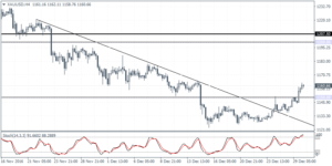 XAUUSD (1160.66): Gold prices have advanced, rising above the 1150 handle and could signal further continuation towards 1200.00. In the near term, watch for a potential dip back to 1150 handle where support could be established. On the 4-hour chart the Stochastics point to a hidden bearish divergence in prices which could potentially keep gold prices subdued in the near term. However, the declines look to be completed for now as long as 1150 forms the new base in the short term. As an alternative, if gold prices fall below 1150, further declines could be seen coming potentially paving way for a test to 1100.