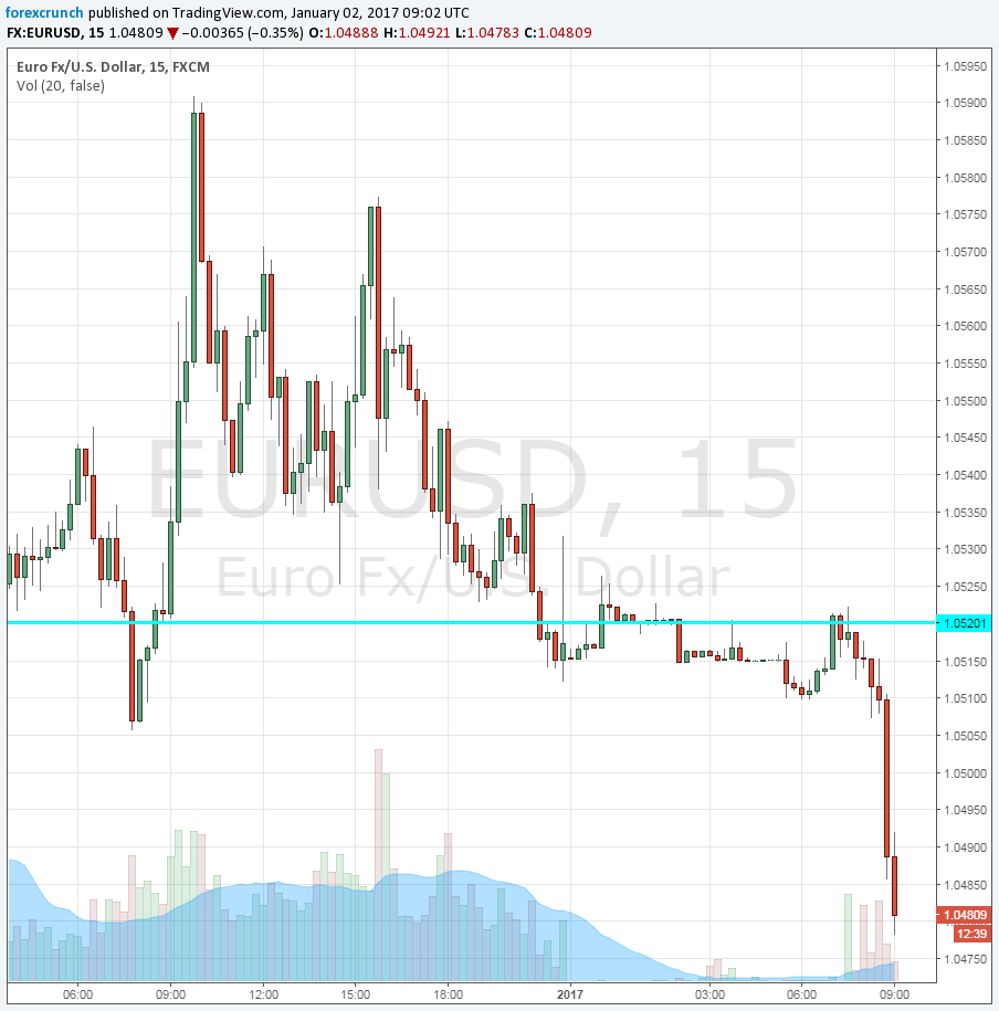 Euro/dollar is currently trading at 1.0477, a drop of 40 pips from earlier in the day. The world’s most popular currency pair was moving quite slowly in the Asian session. This time, low liquidity did not result in wild moves. However, the  first European session of the year already saw a dive.