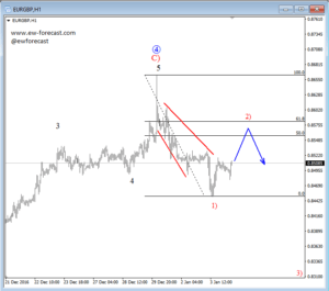 EURGBP is trading at the start of a new bearish run with red wave 1) already completed as an diagonal triangle and now with wave 2) midway through its completion. The ideal reversal and resistance zone for the undergoing wave 2) is around the 50 or 61.8 Fibonacci ratio, from where more weakness may follow.