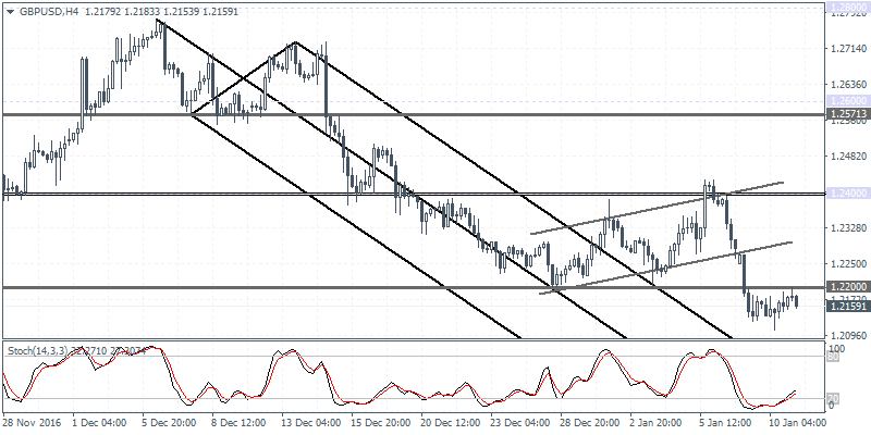 GBPUSD (1.2159): GBPUSD closed with a potential reversal pattern that could see some near-term upside on a bullish follow through today. The price fell to lows of 1.2107 yesterday before recovering from the intraday lows to close at 1.2177. Price action on the 4-hour chart shows the bearish flag pattern that has formed and could signal further downside in the near term with the first support at 1.2040 likely to be tested on a bearish continuation to the downside. The bearish bias could change view only on a daily bullish close above 1.2200.