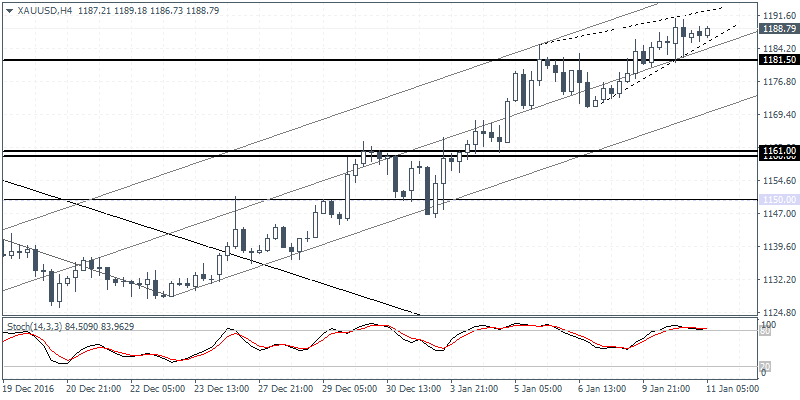XAUUSD (1188.79): Gold prices are posting a steady gain to the upside with yesterday’s bullish close putting the price of the precious metal within reach of a few dollars from targeting the $1200.00 resistance level. The daily Stochastics oscillator is now showing a hidden bearish divergence and could signal a near-term correction after gold prices hit the $1200.00 mark. On the 4-hour chart, gold prices are showing the potential risk of a short term correction towards 1181.50 with a larger correction likely if price breaks below this level on the currently evolving rising wedge pattern.
