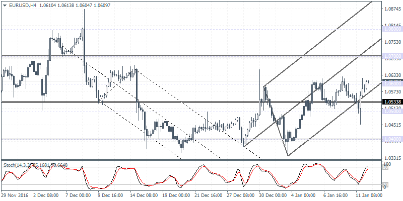 EURUSD (1.0609): EURUSD managed to slip below the support level at 1.0500 before pushing higher with the price now seen trading at 1.0600 handle. This could signal further upside in the near term with the support at 1.0551 likely to hold up the prices for the moment as the single currency could be seen targeting 1.0700. On the 4-hour chart, price action is showing signs of a potential ascending triangle pattern within the rising median line which puts the minimum upside target to 1.0800 following the break of the strong resistance at 1.0700.