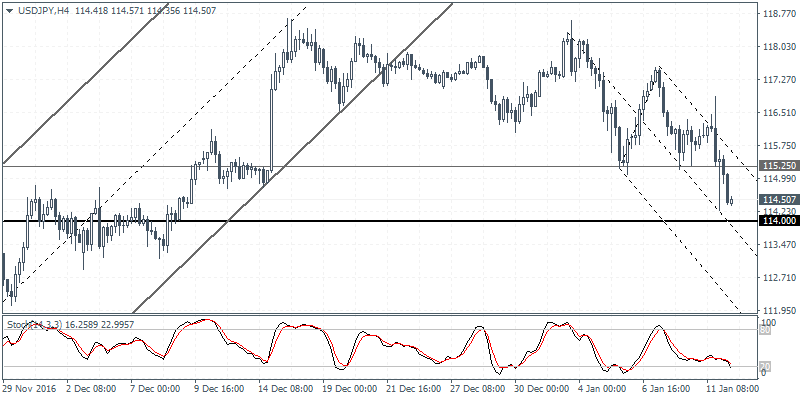 USDJPY (114.50): USDJPY is seen approaching the 114.00 support level after prices topped out near 118.00. Expect a short-term bounce off 114.00 on the initial test of this level which previously acted as resistance. However, the upside could be limited in the near term with USDJPY likely to stay range bound within 116.00 and 118.00 levels. The daily Stochastics looks to be edging closer to the oversold levels which could see a short term bounce ahead of further declines. On the 4-hour chart, USDJPY could be seen retesting the 115.25 price level to establish resistance following which the dollar is looking weaker as it could potentially test 109.75 – 109.50 support to the downside.