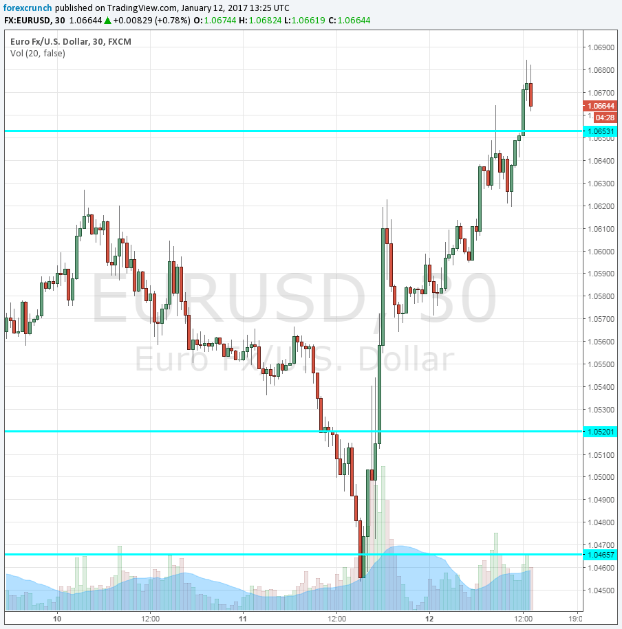 The US dollar dropped on the Donald and continued lower ever since. EUR/USD is already up over 200 pips from the lows, trading at 1.0660 before the release. GBP/USD was just under 1.23 from trading at the 1.20 handle. USD/JPY is around 114.