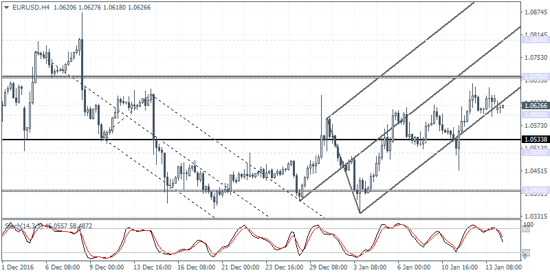 EURUSD (1.0626): EURUSD is likely to maintain the gains from last week with the potential rally stalling near the previously established resistance at 1.0765 – 1.0800. A reversal at this resistance level could see EURUSD remain range bound within 1.0800 and 1.0500 where support has been established near 1.055 – 1.0500. The daily Stochastics is currently pointing to a hidden bearish divergence which could keep EURUSD biased to the downside. In the near term watch for EURUSD to post a reversal near 1.0700 ahead of a decline back to 1.0550.