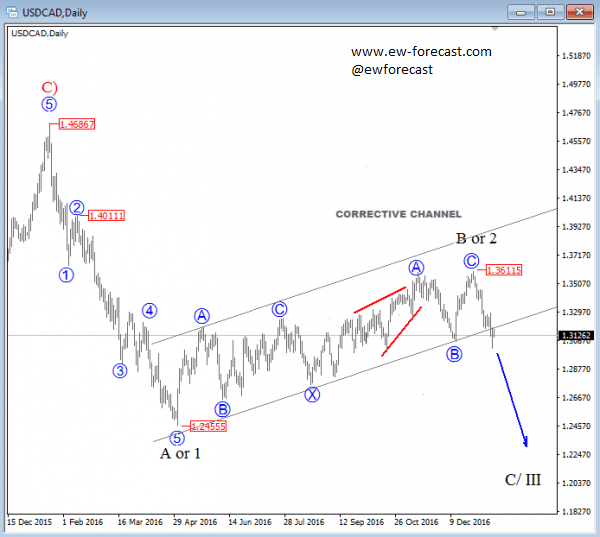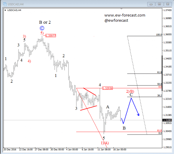 On the lower degree chart, USDCAD is still turning sharply down from a new high that was reached at the end of December near the 1.3600 level. This impulsive drop we labeled as an ongoing wave 1) or A) that appears finished based on a turn up from our Fibonacci projection level the past week. Intraday recovery is sharp, like a small impulse that belongs to a new three wave temporary rally. We are tracking red wave 2)/B) which can revisit 1.3250-1.3300 resistance area before downtrend resumes this week.