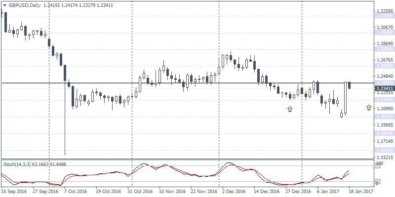 GBPUSD (1.2341): The British pound posted strong gains yesterday, rising from a few pips above $1.2000 to close the day at $1.2400. The gains came as the British PM Theresa May outlined her Brexit vision hoping for a clean break from the EU. Her comments on putting the Brexit deal to a parliamentary vote saw the Cable rally on the day during her speech. Looking ahead, the UK’s jobs report is on the tap today. The GBPUSD daily chart shows the current pullback likely to see a correction back to $1.2200. If this correction is right, GBPUSD could be looking forming a right shoulder for an inverse head and shoulders pattern with the neckline resistance at $1.2400. A reversal off $1.2200 price zone could see GBPUSD position for a move towards $1.2800 at the very least.