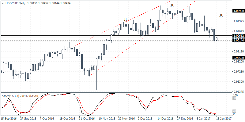 USDCHF (1.0034): USDCHF broke below the 1.0061 support level yesterday with price action showing initial signs of bouncing back. A bullish correction off the 1.0061 – 1.0014 could potentially keep USDCHF biased to the upside with the potential head and shoulders pattern still evolving, although still in the early stages. The daily chart on USDCHF shows the Stochastics moving strongly into the oversold level which could signal a potential slowdown in the momentum as the dollar is likely to post a short term correction. The price zone near 1.0231 – 1.0166 remains the key level where we can expect to see USDCHF post a reversal and thus forming the right shoulder.