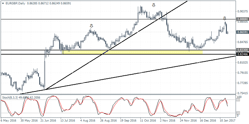 EURGBP (0.8659): EURGBP fell sharply yesterday and gave back the initial gains made earlier in the week on Monday as price gapped higher. The strong declines seen yesterday could potentially mark the start of a new downtrend in EURGBP with the initial support at 0.8330 – 0.8246 likely to be the first price level that could offer a short-term bounce. For the moment, the bearish reversal is showing a potential right shoulder in the head and shoulders pattern which will be validated on a decline towards the neckline support established at 0.8330 – 0.8246.