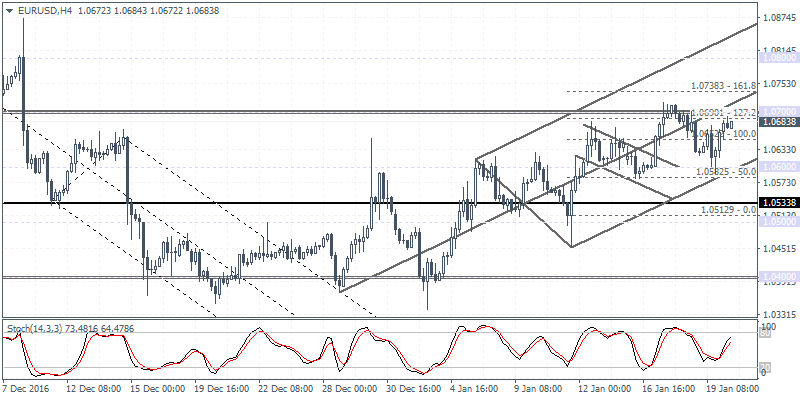 EURUSD (1.0683): EURUSD fell briefly below 1.0600 yesterday but managed to bounce back higher to close on a bullish note. Price action remains poised to the upside as EURUSD will test the resistance level of 1.0765 – 1.0800 in the near term. Failure to breakout above this resistance will see EURUSD slide back towards 1.0550 – 1.0500 support level, which will keep the single currency range bound for a certain period with further continuation coming on a breakout from either of these two levels. The daily Stochastics is also overbought currently and points to a hidden bearish divergence that signals a potential correction to the downside. On the 4-hour chart, EURUSD tested the bullish flag breakout, and the pattern remains valid with further upside towards 1.0738.