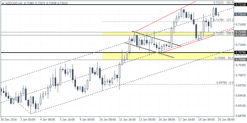NZDUSD (0.7201): NZDUSD is seen testing the previous highs near 0.72160 following the retracement from the initial leg of the bullish flag breakout. Price action remains within reach of the 0.7232 resistance level of the bullish flag pattern but watch for a potential decline back to 0.7145 – 0.7134 support level which could be tested as broadening wedge pattern emerges. The bullish flag’s objective towards 0.7232 remains intact, but in the case of a reversal, NZDUSD could be looking at falling ot 0.7135 support and potentially extending the declines down to 0.7080.