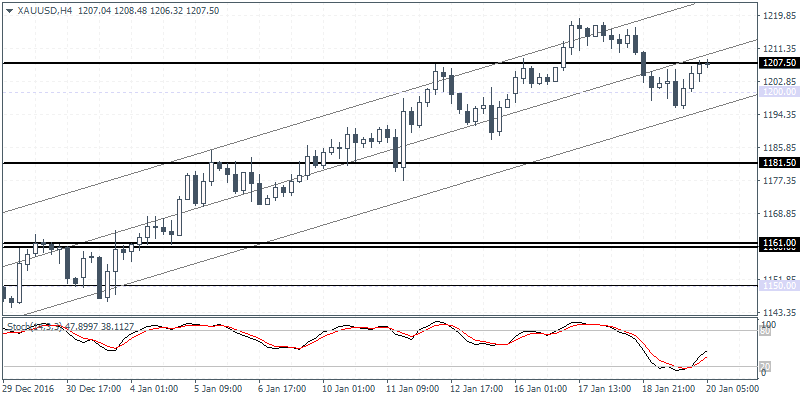 XAUUSD (1207.50): Gold prices closed with a doji pattern yesterday bouncing off the 1200.00 support level indicating indecision at the current levels. The bias remains to the downside, however, the support level needs to be broken in order to confirm this view. In the near term, gold remains range bound within the price levels of 1217 and 1200 with further continuation coming on a breakout from these levels. On the 4-hour chart, the Stochastics has posted a correction to below 20 with the oscillator indicating rising momentum. However, look for a reversal here to confirm the downside move below 1200, as gold prices will slide to the support level of 1181.50.