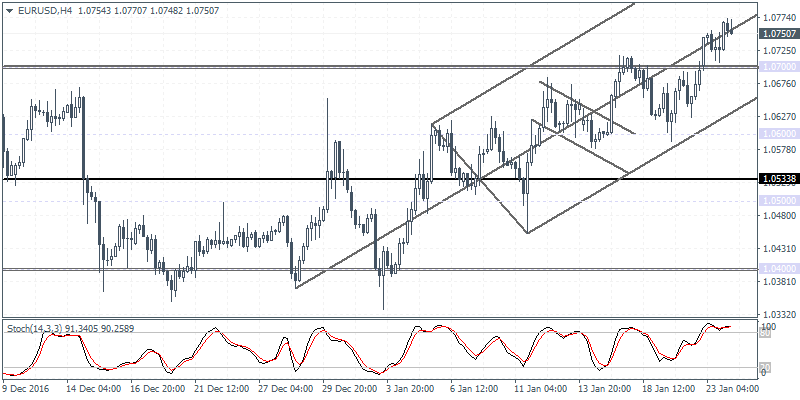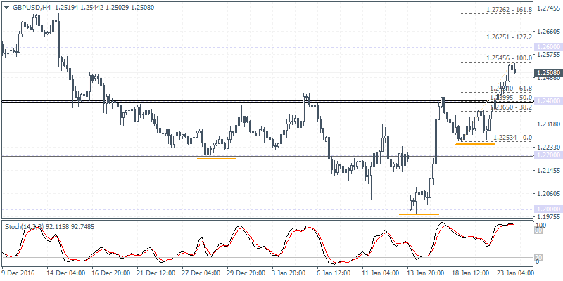 EURUSD (1.0750): EURUSD could be in for a short term correction to the downside after price rallied towards 1.0765 – 1.0800 resistance level yesterday. The breakout from 1.0500 off the falling median line saw a straight rally with little to no pullbacks. Furthermore, there is a chance that the current pullback from 1.0765 – 1.0800 will result in a right shoulder formation of the inverse head and shoulders pattern near 1.0600 – 1.0551. This could potentially pave the way for a medium-term rally towards 1.1100. On the 4-hour chart, EURUSD is seen trading near the rising median line with the potential for the declines to extend on a break down below the support level at 1.0700. Watch for a retracement back to 1.0700 for a confirmed move to the downside towards 1.0600.