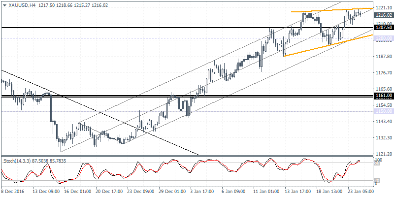 XAUUSD (1216.02): Gold prices continue to maintain their gains after price tested the $1200 support level a few days ago resulting in a doji pattern and a bullish follow through. Further upside gains could see gold prices rise towards the resistance level of 1240 – 1250, but the risks of a downside correction remains. On the 4-hour chart, gold prices are seen consolidating into a triangle pattern which will see a decline towards 1189 at the very least if price breaks down to the downside. The major technical support is seen at 1161.00, however, where a correction is likely to occur with the technical support pending a retest.