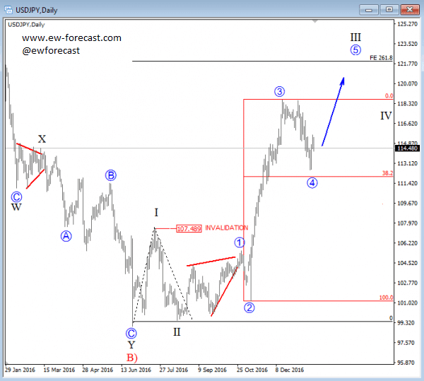 Regarding the 4h chart. USDJPY is turning bullish after a very deep corrective retracement in wave 4. It was a double zigzag that has bottomed earlier this week. So far there is a nice bounce back to 115.60 bullish level where the breakout will be a new confirmation for higher prices, after that broken channel that occurred already 24 hours back. As such, we believe that wave five will see much higher prices and that 118.65 can be seen again in February.