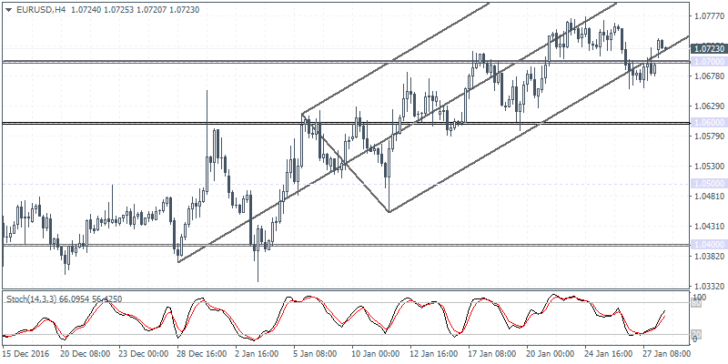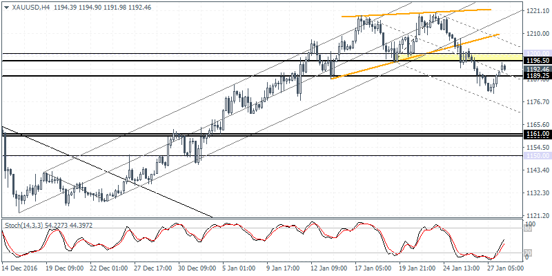 XAUUSD (1192.46): Gold prices are looking to retest the $1200 price level where resistance could be established following last week’s breakdown below this price level. On the 4-hour chart, the retracement could, however, lose steam with the Stochastics showing a strong hidden bearish divergence at the current levels above 1189.25. However, watch for a reversal near 1197.50 – 1200 region where gold prices could retrace before reversing and resuming the declines. A breakdown below 1189.25 could signal further declines down towards 1161.00 in the medium term.