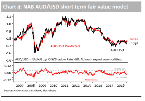 AUD still on the weak side of fair value. We noted in our previous update that one reason for the AUD/USD recovery off its last December 2016 lows – weaker USD aside – was the failure of concerns about heightened Chinese capital outflows and a weaker CNY/EM Asia FX in general, to materialise. Pressure on the Yuan has been successfully resisted by the PBoC. There may still be residual concerns about President Trump initiating a trade war with China, such that risk appetite – at least as it affects the AUD – is not as buoyant as that simply reflected in the VIX (the risk proxy in our short term fair value model). This might help explain why AUD/USD continues to trade on the weak side of our STFV estimate (currently ~0.77, see Chart 4). If so, it probably continues.