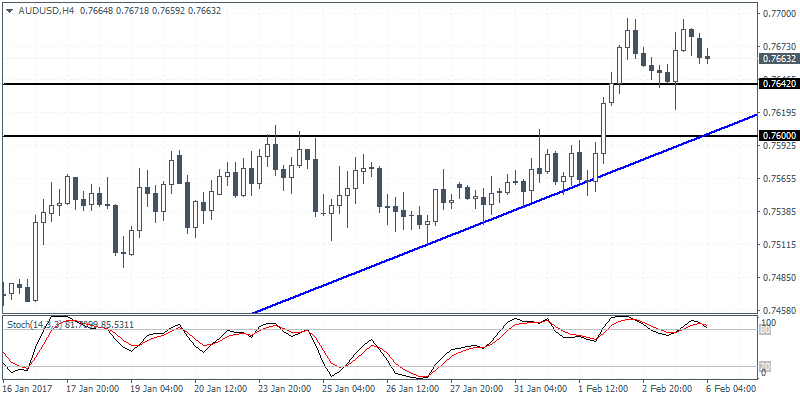 AUDUSD (0.7663): The Australian dollar is seen trading weaker this morning after a soft patch of economic data. Retail sales for the month of December showed a sharp decline, falling 0.1% against estimates of a 0.3% increase. The Australian dollar closed last week on a bullish note coming after a doji candlestick the week before. This could potentially indicate further upside to come ahead of a minor dip to 0.7600. On the 4-hour chart, price action looks to have formed a double top pattern with the Stochastics indicating a bearish divergence. Watch for AUDUSD to break down below 0.7642 for a correction towards 0.7600.