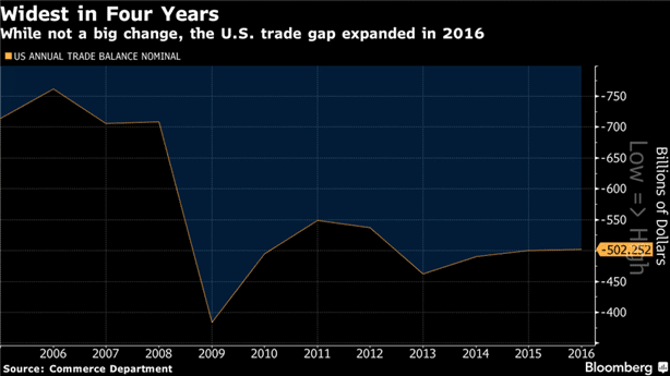 For the whole year, the U.S. posted a foreign trade deficit of $502.25 billion. It has been the highest annual level recorded since 2012 and increased 0.4% from the year before. The trade deficit recorded was about 2.7% of the GDP in 2016, posting a modest decline from 2.8% of GDP in 2015.