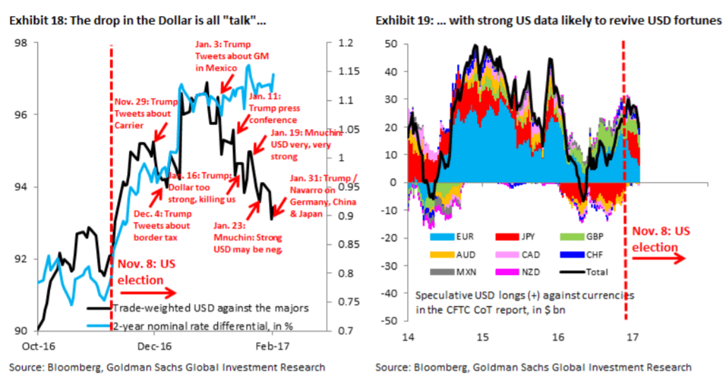 We would say two things. First, we think the ‘Dollar down’ rhetoric says more about the constraints facing President Trump, rather than likely outcomes. After all, a policy mix that combines fiscal stimulus and protectionism is hard to reconcile with a weaker currency, even if that is what the new administration wants. Second, speculative Dollar longs are more modest than they were a year ago, in particular where EUR/$ is concerned (Exhibit 19).