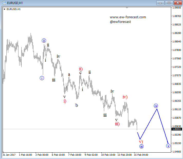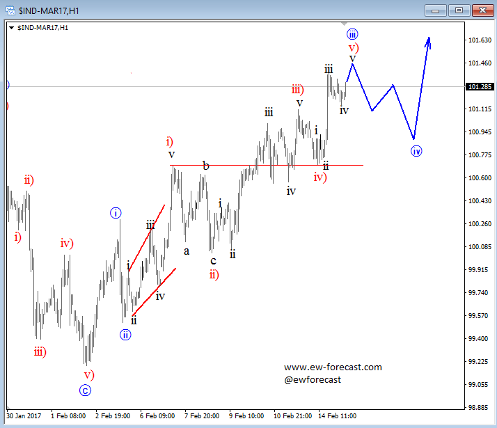 USD Index is on the rise, now trading at a new high which puts some bullish pressure on USDJPY and bearish on EURUSD, while Cable, Aussie and New Zealand dollar are doing quite well at the moment. From a technical perspective, we see USD Index in a new impulsive bullish trend which is expected to continue higher, but corrections will occur. Currently we see the index in the late stages of an extended blue wave three which can see a temporary top near 101.50/60 area from where a new short-term pullback may show up. Same thing is for EURUSD, where an updated count shows the price in red wave v) of three, so some support can be seen in the near-term close to 1.0500.