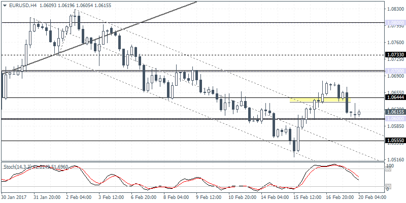 EURUSD (1.0615): EURUSD’s reversal on Friday saw prices breaking down below 1.0644 by the end of the day. Although this morning’s price action is a bit bullish, EURUSD could be seen testing 1.0600 here support is likely to be found. A bounce of the 1.0600 support could signal a continuation to the upside targeting 1.0700 followed by a move towards 1.0800. Alternately, failure to establish support at 1.0600 could mean further decline in prices as EURUSD could slide towards 1.05550 support.