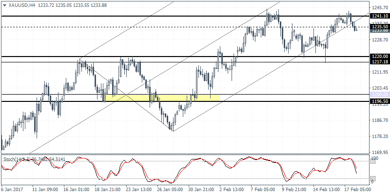 XAUUSD (1233.88): Gold prices were seen retesting 1241 resistance last week, but failure to break out higher has signaled a near-term push lower. A breakdown below 1235.50 could signal near-term declines as gold prices could be seen testing the lower support once again at 1220.00 – 1217, which was briefly tested last week and was met with strong rejection at these levels. Price action on the 4-hour chart also shows a possible double top pattern being formed which could mean that a breakdown below 1220 could signal further declines towards 1200.00 at the very least.