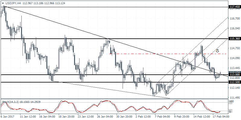 USDJPY (113.12): USDJPY is looking to post a reversal after falling to 113.00 support last week. The rebound from the support zone at 113.00 – 112.50 could signal a short-term move to the upside in USDJPY which could see prices potentially rally back to target 115.36. The 4-hour chart also shows a hidden bullish divergence at the current level, meaning that USDJPY could see some consolidation within 113.00 – 112.50 following which an upside move can be expected. This bullish bias will be invalidated on a close below 112.50.