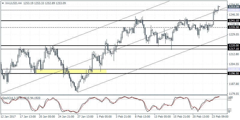 GBPUSD (1.2559): The British pound has managed to break out from the consolidating triangle that price was stuck t for nearly three weeks. A breakout above 1.2566 marking the triangle pattern’s high is required to sustain further gains to the upside as GBPUSD will target 1.2700 resistance level, the highs from February 1. The downside in GBPUSD is looking limited for the moment, although this could change in the event of price breaking below 1.2500, in which case GBPUSD could continue its sideways price action.