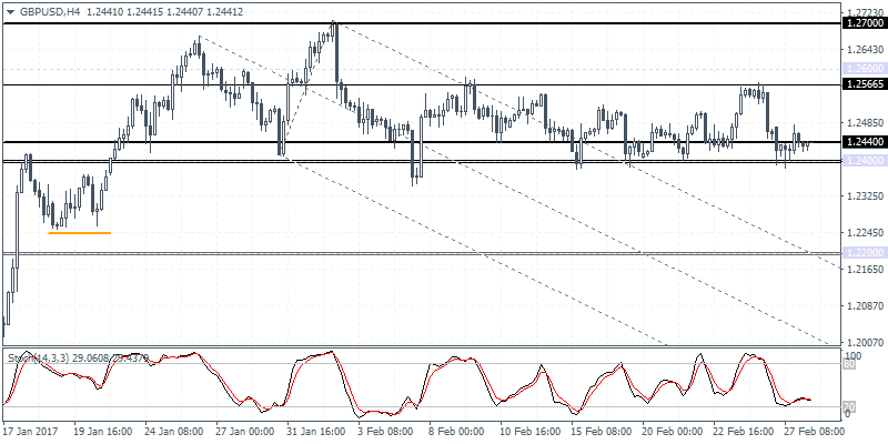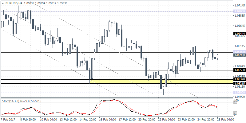 EURUSD (1.0593): EURUSD’s ranging price action continues after the recent declines from 1.0800 since late January and the sideways range established between 1.0800 and 1.0500. On the 4-hour chart, the single currency is looking to regain control to the upside, but this bullish bias can be confirmed only on a close above 1.0600. We could, however, expect EURUSD to remain range bound within 1.0600 and 1.0500 in the near term with a breakout from these levels likely to establish further direction in the near term.