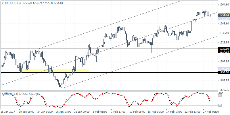 XAUUSD (1254.04): Gold prices gave up the intraday gains yesterday and closed bearish following a test to the 3-month of 1263.83. On the 4-hour chart, the reversal came with a sharp doji which could signal the downside in prices. But watch for the psychological support at 1250.00 which could keep gold prices well supported in the near term. A break down below 1250 support could, however, signal further declines down towards 1220.00 – 1217.20 support level. Today’s speech by the U.S. President and the revised GDP report will likely be the catalyst for gold prices in the short term.