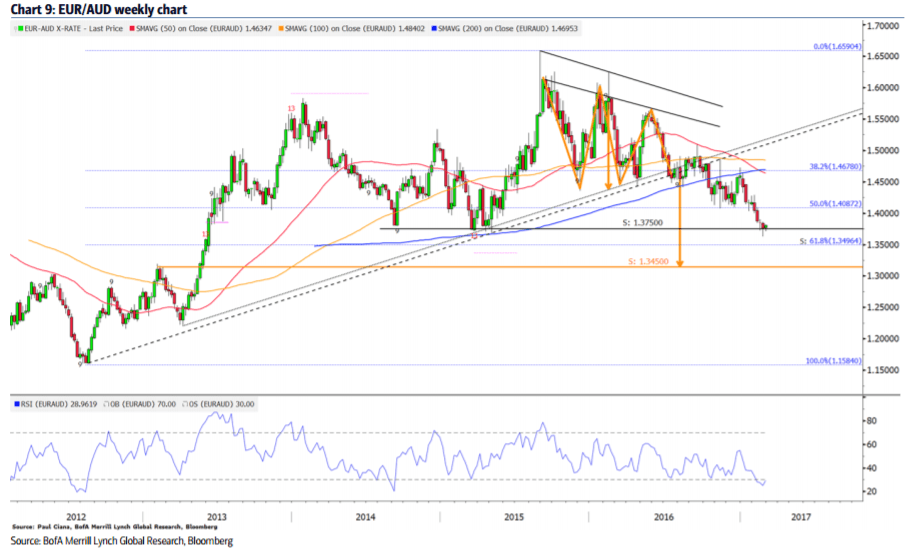 EUR/AUD: A broad triangle top, major trend line breakdowns and bearish moving average crosses are bearish for EUR/AUD.