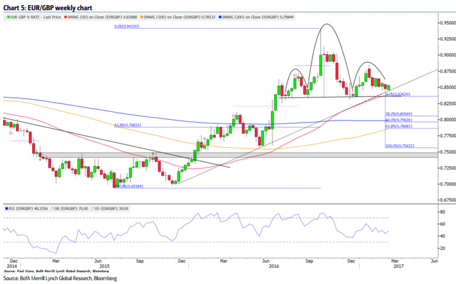 EUR/GBP: The essence of a head and shoulder top is present. Spot continues to roll over to form the right shoulder.