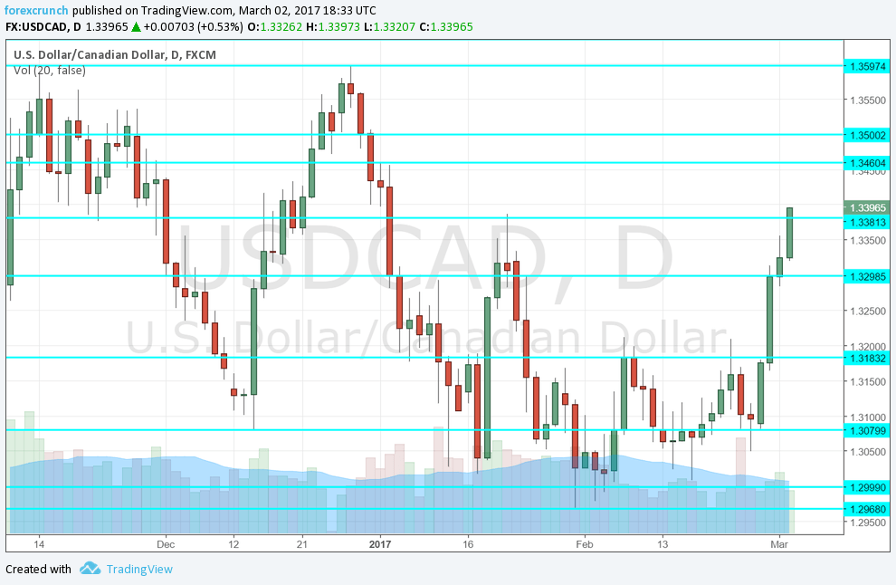 Dollar/CAD trades around 1.34, above resistance at 1.3380 and under 1.3460. Here is how it looks on the chart: