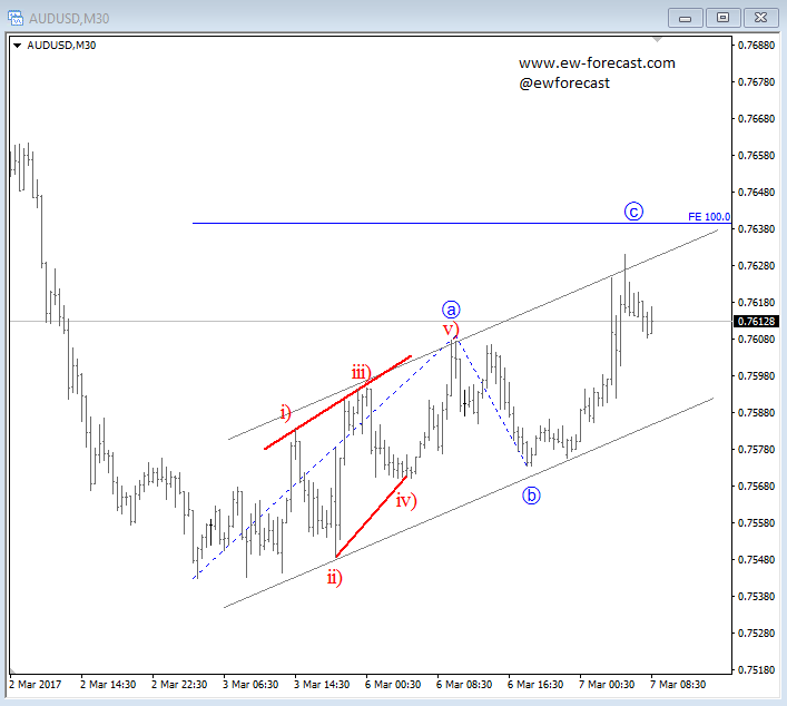 We have seen some upside for the Aussie in the overnight session after RBA statement, but on the 30min chart we see a three-wave rally which can be a correction that may stop at 0.7630/40 area. The price is now at potential resistance, so watch out for a turn down and a possible break of the lower trendline which would confirm a bearish continuation.