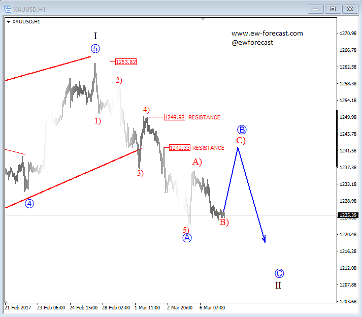 Another reason we think that AUDUSD can stay under pressure is also gold which is looking bearish after a five wave decline from 1263. We see this leg as wave A that belongs to a bigger corrective set-back so more weakness after wave B bounce will be in view, which may cause a new leg down on the Aussie as well.