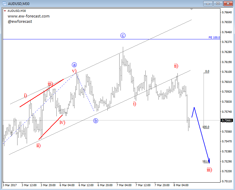 Aussie is turning down on the intraday chart, following a completed three wave rise yesterday near 0.7630. That was a corrective recovery so we think that the pair will break to a new low for this month especially now following a strong decline out of a corrective channel.