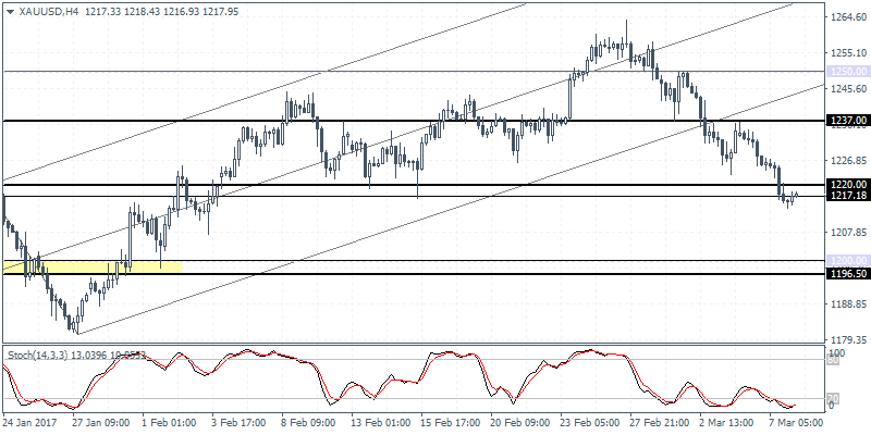 XAUUSD (1.2237): Gold prices are attempting to post a recovery following the doji pattern that appeared on the 4-hour time frame near the support, just a few points off 1217 support level. A follow through here could see some moderate bounce that could keep gold prices range bound within 1237 and 1220 – 1217 support level. Ideally, price action could be seen retesting back to the 1237 level where resistance could be established ahead of a dropback to the 1220 – 1217 region.