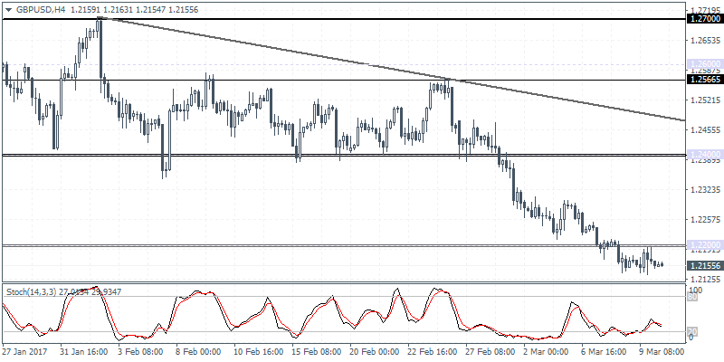 GBPUSD (1.2155): GBPUSD closed in a doji candlestick pattern on the daily session yesterday, but price action is expected to remain range bound within 1.2200 resistance level and the support level at 1.2100. Further gains or losses can be expected only on a break out from either of these two levels. Traders should, however, note that bullish divergence that is showing on the 4-hour chart, which when considered with the doji on the daily chart could signal some near-term upside risks. A breakout above 1.2200, could potentially turn the short-term trend in GBPUSD to bullish as prices could target 1.2400 resistance level.