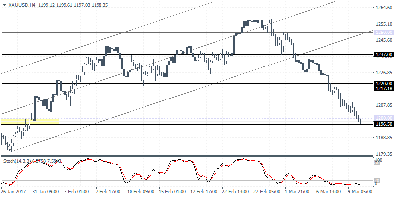 XAUUSD (1198.35): Gold prices are trading near the support level at 1200 as noted in the past few daily analysis reports. However, further declines can be ruled out as we expect gold prices to remain range bound within 1200 and 1220 levels. There is scope for an upside retracement above 1220, which could see gold test 1237 resistance level. On the daily chart, the current (higher) low in price has printed a lower low on the Stochastics, meaning that the hidden bullish divergence, with the price at support, could see some upside risks.